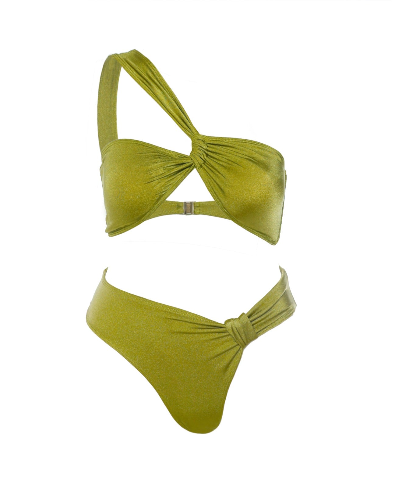 It’s your time to shine on the gram and around the pool.Stay out of the crowd and take a walk on the wild side with our Green this season. This fashionable Cacia bikini in Green is designed for those who set wild trends. Cacia revisits the 90s with this bandeau bikini top.This piece is accented with a signature asymmetric one-shoulder silhouette, removeable pads and an adjustable strap on one side of the bottom to create this asymmetric effect. Ooze in glamour and style in this eye-catching bikini.