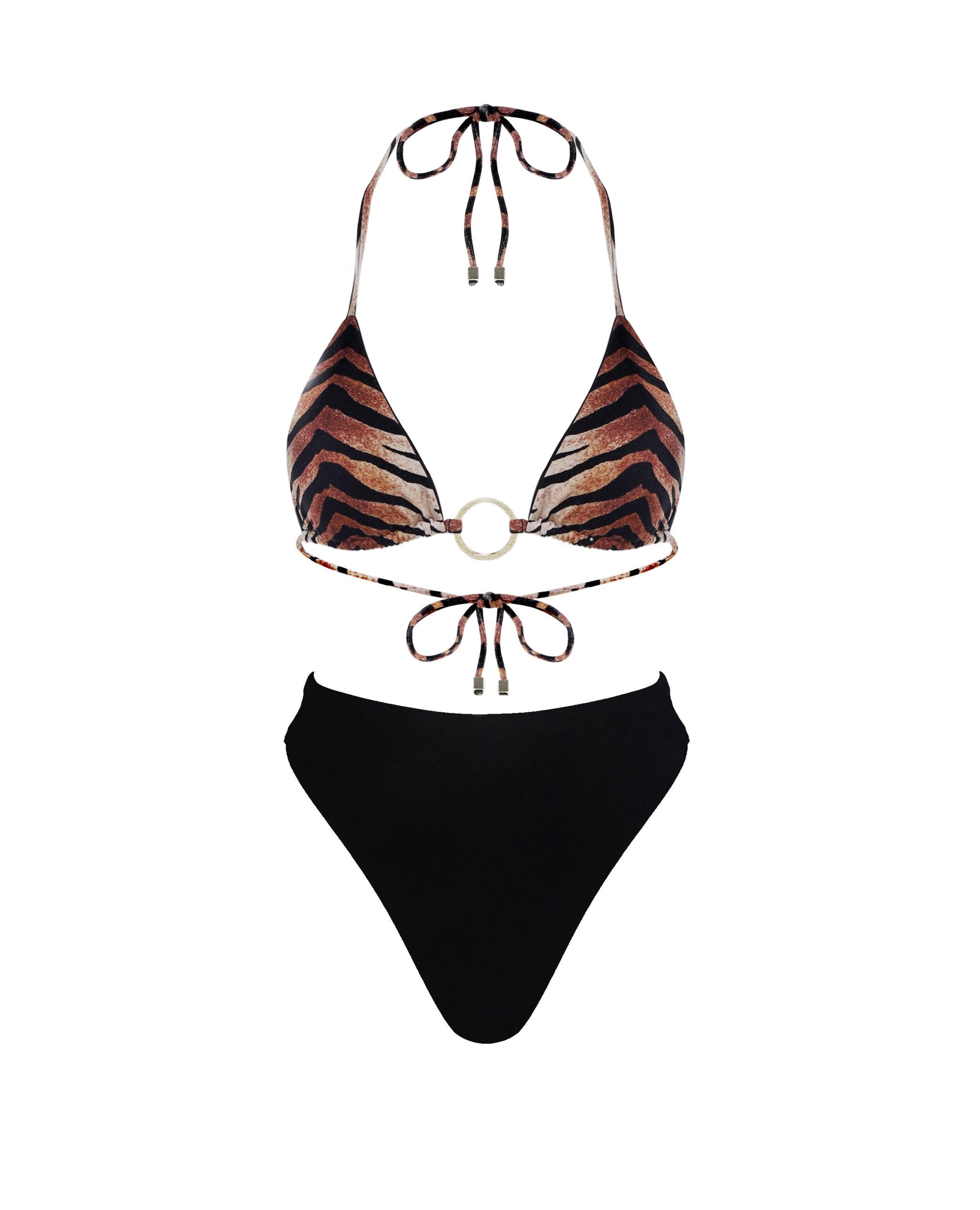 Unleash your poolside ultimate look with the Iris & George bottoms in our 90’s tiger print. A retro inspired bikini that shouts class, sophistication and style. The halter-neck Iris top features a gold circular trim that captures an understated glamour and adjustable slender straps. The retro high waisted bikini bottoms is designed to flatter the hips and the tummy area while snugging you in all the right places while providing a slimming and shaping effect.  The George high waisted bottoms features a high-rise cut to elongate your silhouette and medium coverage to perfect your contemporary retro look. Match the George Bottoms with the Iris top in Tiger print, with the Stephany front tie top or with our Isabella Top.