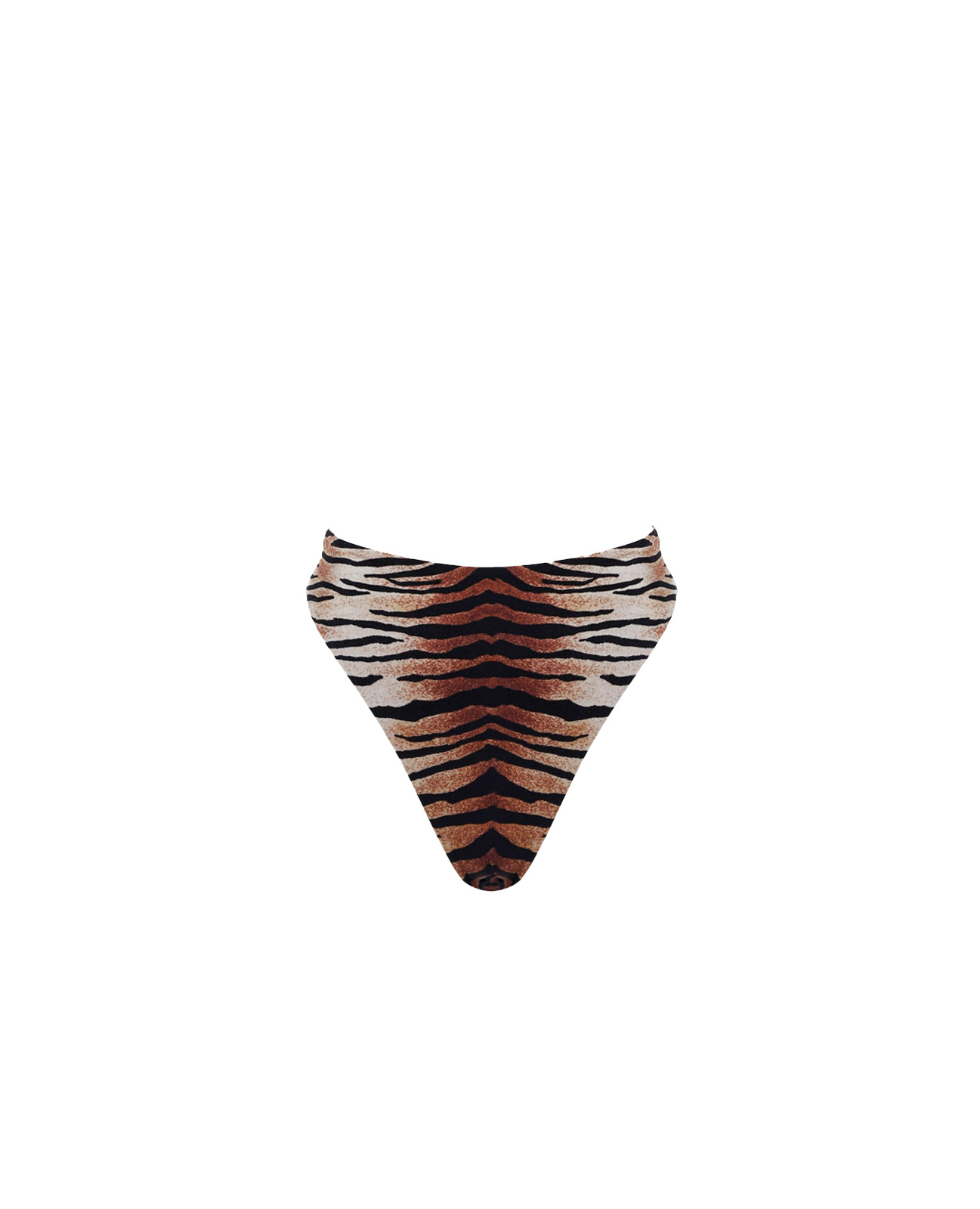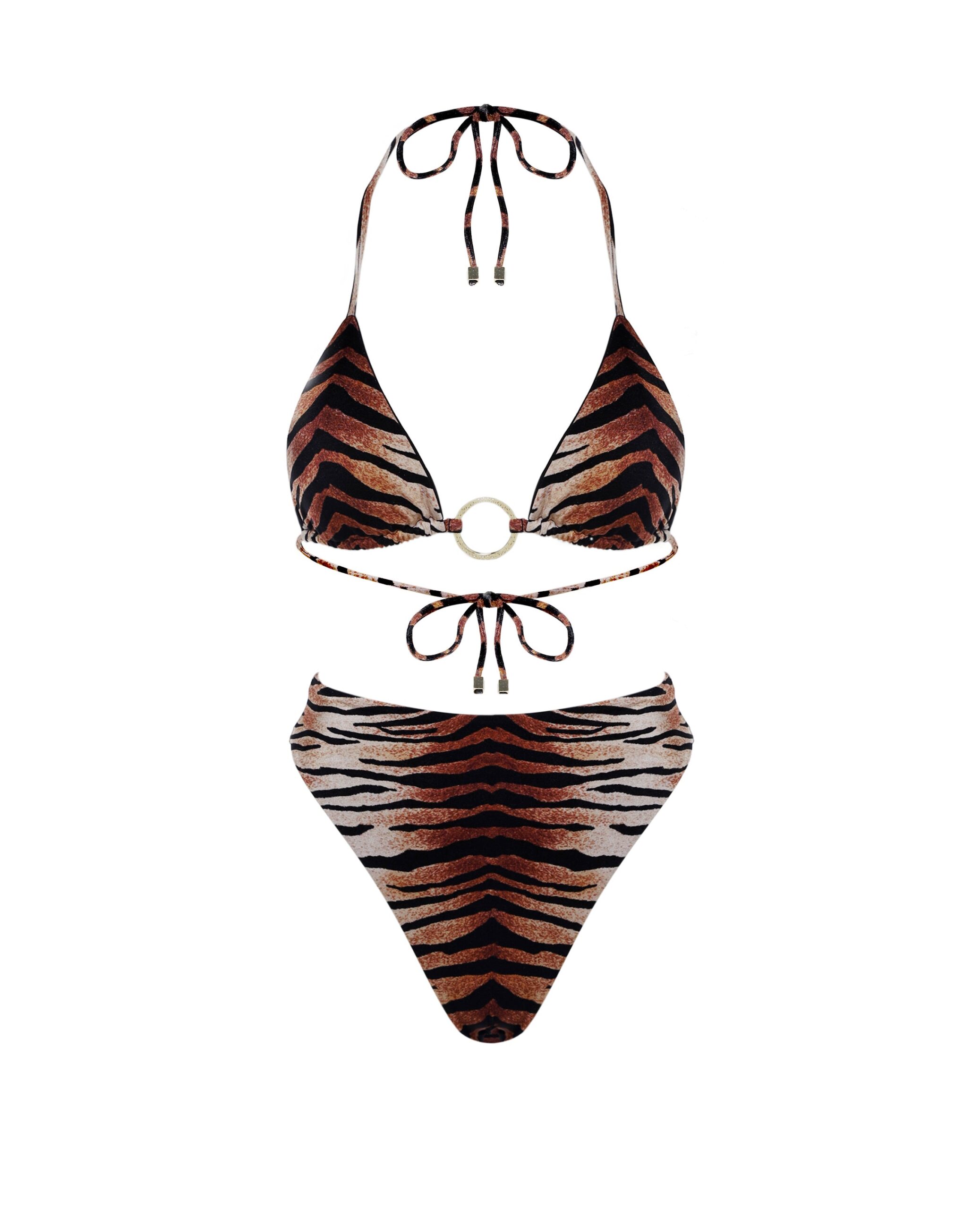 Unleash your poolside ultimate look with the Iris & George bottoms in our 90’s tiger print. A retro inspired bikini that shouts class, sophistication and style. The halter-neck Iris top features a gold circular trim that captures an understated glamour and adjustable slender straps. The retro high waisted bikini bottoms is designed to flatter the hips and the tummy area while snugging you in all the right places while providing a slimming and shaping effect. The George high waisted bottoms features a high-rise cut to elongate your silhouette and medium coverage to perfect your contemporary retro look.