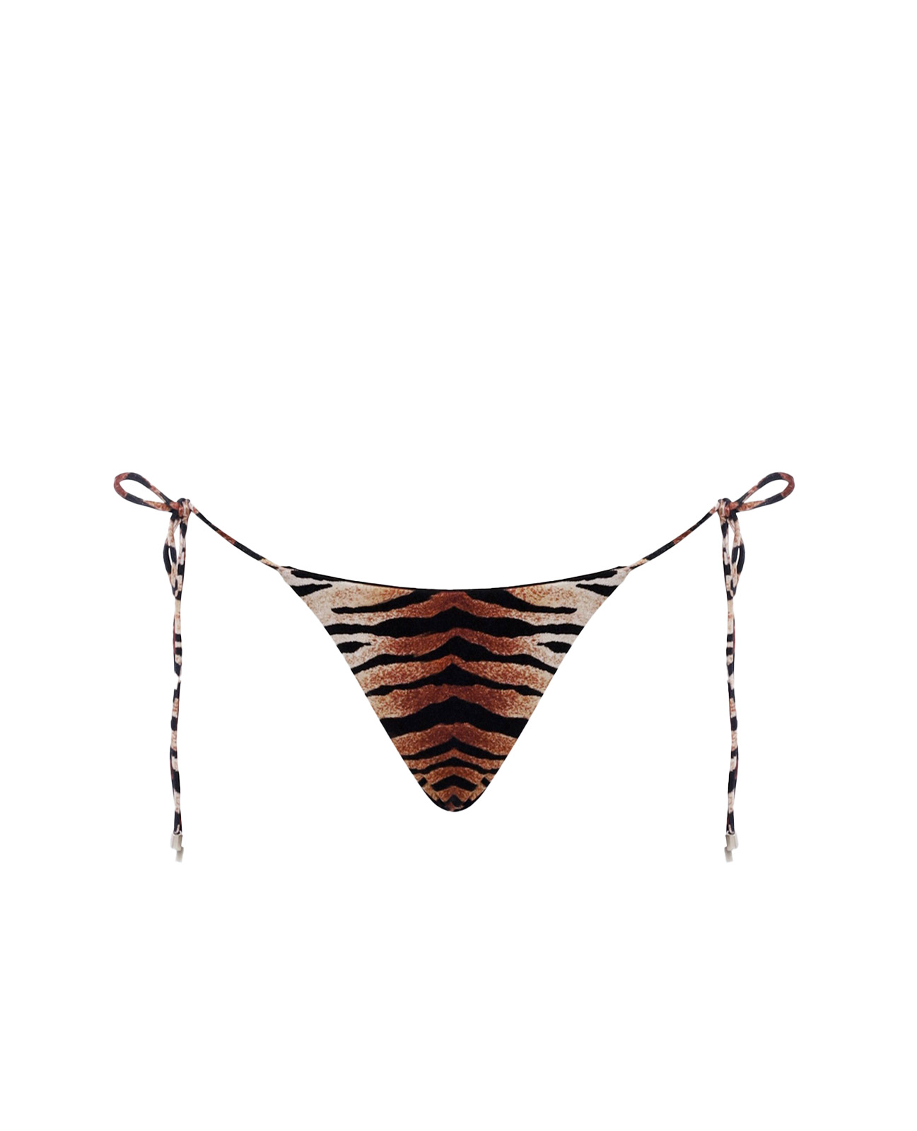 Versatile and create that edgy, bold look with the Herry bottoms in the 90’s animal tiger print matched with the Hazel bandeau top. A contemporary design with a vintage flair featuring a low waisted side-ties bottoms that can also be worn high-rise to elongate your legs. The Hazel top features a circular trim at the center that captures an understated glamour with a tie at the back that adds a noticeable cute detail. Strap free sunbathing in style in this beautiful bikini set.