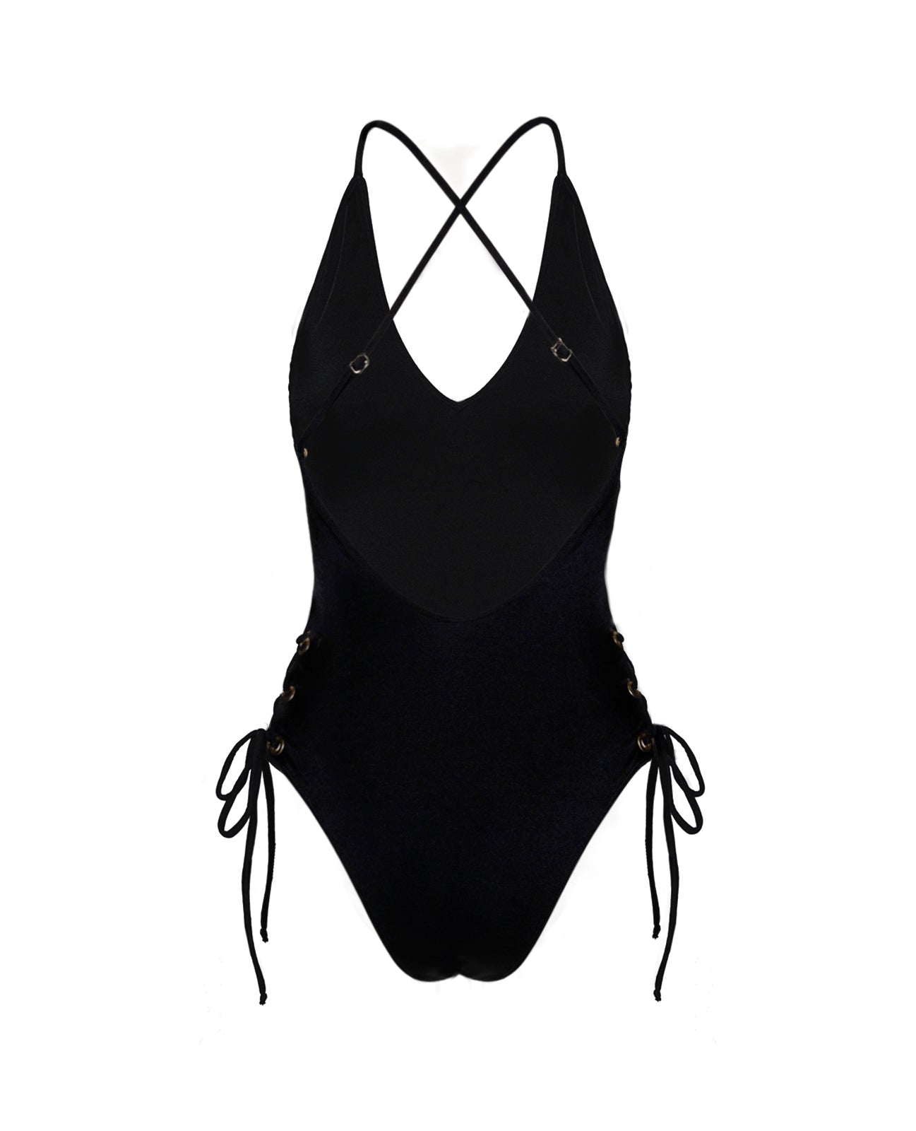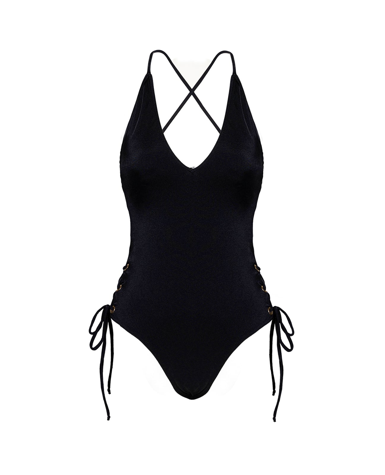 A sleek one-piece crafted from lustrous Italian Lycra with a plunging neckline and adjustable over-the-shoulder straps. The Ibiza Swimsuit in Black features side-tie detailing with gold eyelets, a criss-cross back, and removable padding for a sculpted, supportive fit. Effortlessly bold, this design captures modern luxury in every curve.
