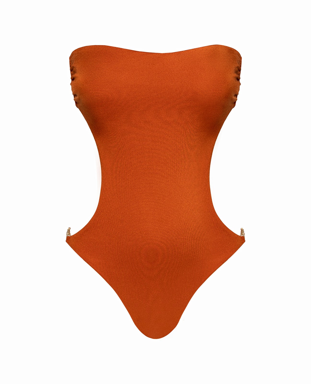 A sculpting strapless one-piece in sun-kissed amber glow, crafted from buttery-soft Italian Lycra. The Priyana features bold side cutouts, gold hardware, and a smooth, shaping fit that radiates luxury. The perfect designer swimsuit for golden-hour escapes and modern resort elegance.