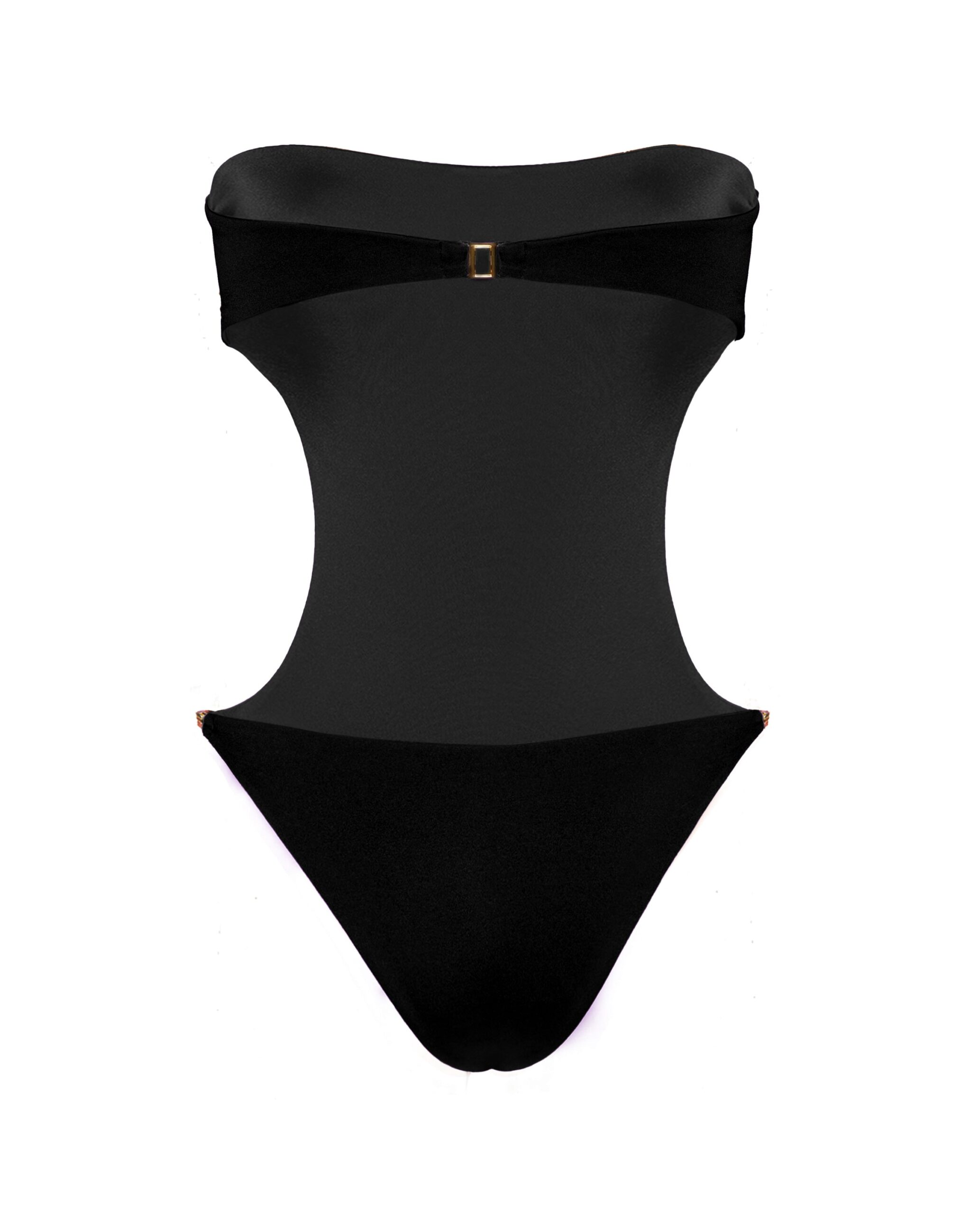 Timeless. Refined. Effortlessly seductive. The Priyana Swimsuit in Black is a sculpting strapless one-piece made from ultra-soft Italian Lycra with side cutouts and gold detailing. A luxury black swimsuit that defines sophistication from beach to yacht.