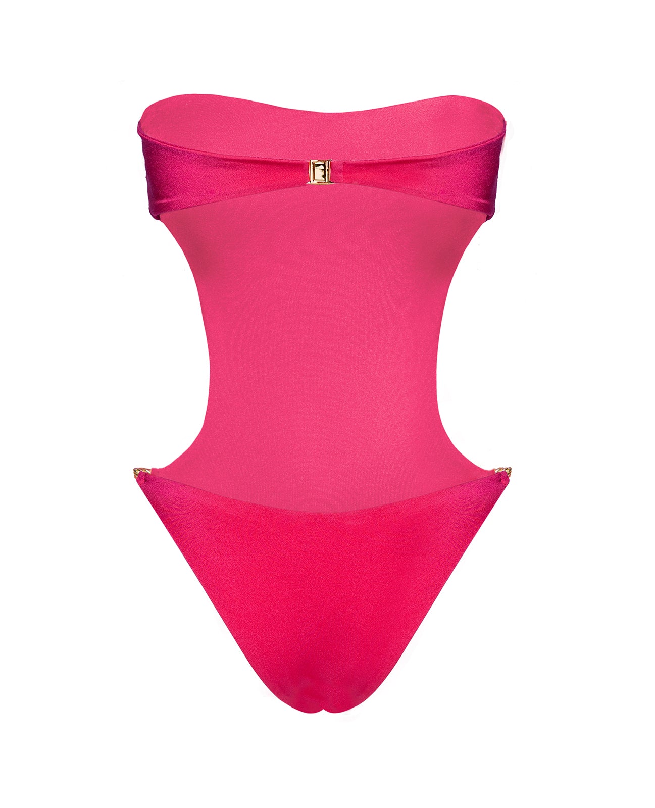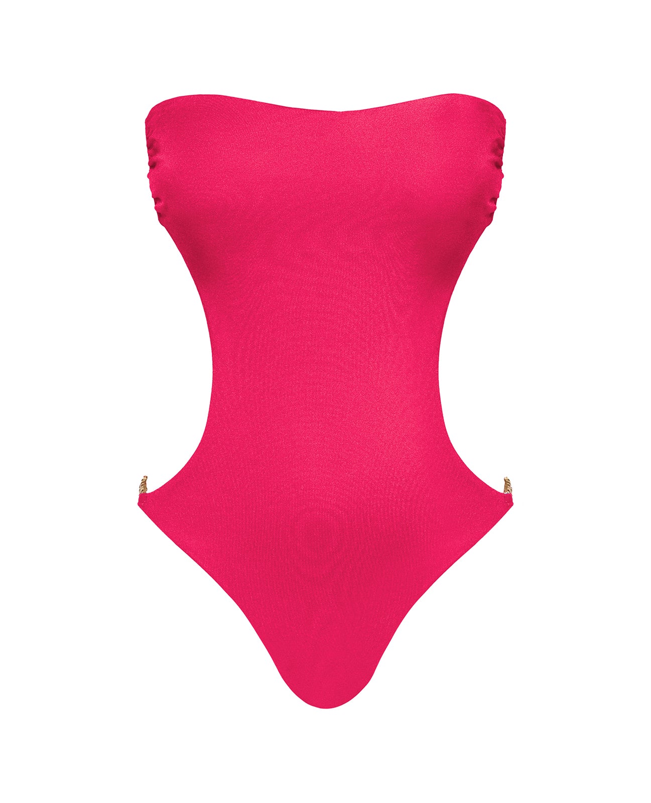 A sculpting strapless one-piece crafted from luxurious Italian Lycra. The Priyana Swimsuit in Soleil Rouge features bold side cutouts, a gold clasp, and a smooth, body-hugging fit that defines modern resort elegance. Designed for sun-soaked escapes and timeless confidence.