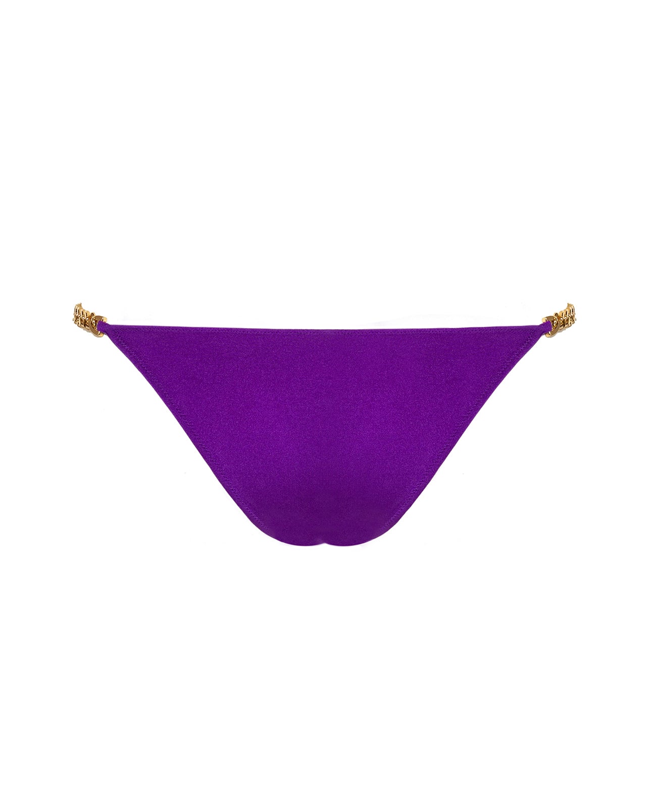 A low-rise bikini bottom in rich Purple Reign, adorned with gold chain sides for subtle shimmer. Crafted from double-lined Italian Lycra, the Rose Bottom offers a smooth, body-hugging fit with medium coverage.